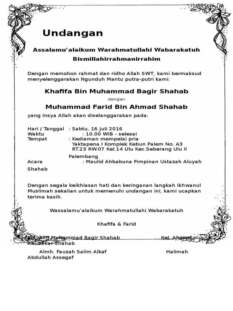 Pada sisi cover depan undangan ini terdapat isian berupa tulsan judul The. Singkat cerita acara ngunduh mantu. Masih bersama zoobaID kali ini dalam postingan Download Kumpulan Format Undangan Microsoft Word - berikut ini kami Bagikan beberapa contoh format atau file undangan dari berbagai macam acara seperti walimatul ursy walimatul khitan selapanan tahlil 40 hari 100 hari pendak 1 dan 2 seribu hari haul walimatul aqiqah.